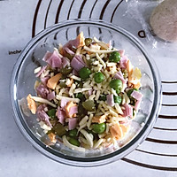 Drain the pickles, dice the ham, add green beans and mozzarella to mix