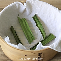 Find a steaming cloth, put it on the steamer, and put a few pandan leaves on it.