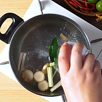 Add galangal, lemongrass, and lemon leaves and bring to a boil