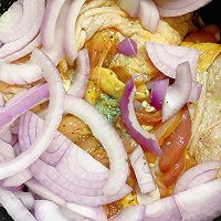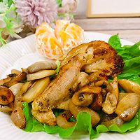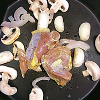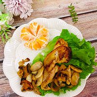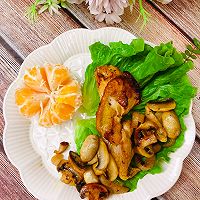 Heat oil in a pot, add a piece of chicken steak and mushrooms, sprinkle a little salt on the mushrooms, and fry the chicken leg steak until golden brown and cooked on both sides