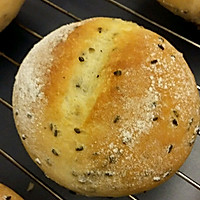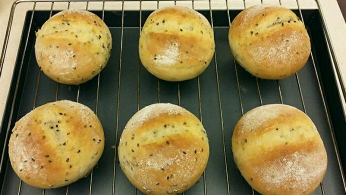 1. Mix and knead all ingredients except surface decoration and black sesame seeds until the film comes out 2. Add black sesame seeds, knead well, roll the dough into a circle, put it in a basin, and ferment for about 1 hour to 2 times the size 3. Move the dough to the worktop, drain the air in the dough, divide it into 6 parts evenly, roll it into a circle, cover with plastic wrap and wake up for 15 minutes 4. Exhaust the 6 doughs in turn, then roll them into a circle, and ferment for a second time for about 1 hour until the dough is twice the size 5. After fermentation is completed, make a knife on each of the 6 doughs, divide 15g of butter into 6 parts, stuff it at the edge of the knife, sprinkle high-gluten flour on the surface, and put it into a preheated oven , 180 degrees, 20 minutes is enough