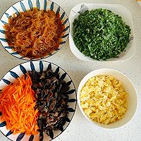 Wash and chop the leeks, shred the carrots and fungus, soak the vermicelli into sections, pour a little oil and dark soy sauce, stir well, and scramble the eggs