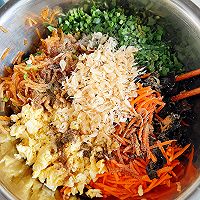 Put the leeks and carrots into a basin, add a little cooking oil, stir well to lock in the water, then add other ingredients in turn, and finally add an appropriate amount of dried shrimp, salt, thirteen spices, black pepper, and chicken essence and stir well
