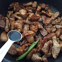 Add a little oil to the wok, pour in the meat pieces, dark soy sauce and stir-fry until colored
