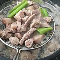 Put the pork in cold water and add green onions, ginger, and cooking wine to a boil over high heat for 5 minutes