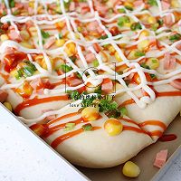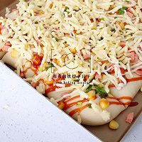 Sprinkle with corn kernels, diced ham, chives, and squeeze with tomato sauce and salad dressing.