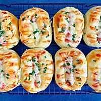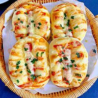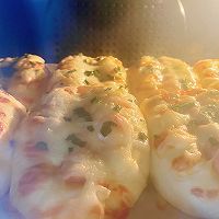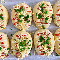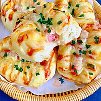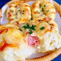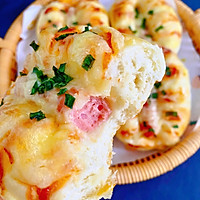 Fermented dough, put ham sausage in the middle, squeeze salad dressing tomato sauce on the surface, add an appropriate amount of mozzarella cheese crumbs, sprinkle chopped green onions on the surface, and preheat the oven