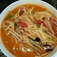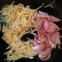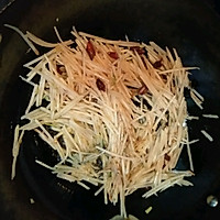 The red peppercorns in the pot are oiled, remove the peppercorns after they change color, put the chopped chili peppers into the pot to get a fragrant aroma, and then add shredded potatoes and stir-fry.
