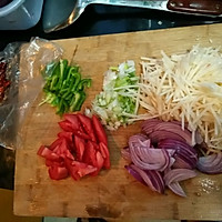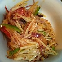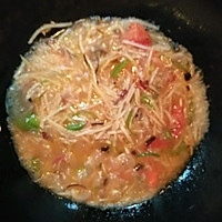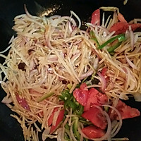 Add shredded green peppers, tomato cubes, salt, and continue to stir-fry.