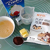 Puff crust: 50 grams of puff pre-mixed powder, 5 grams of cocoa powder, 50 grams of water, 75 grams of eggs, 35 grams of butter Milk oil filling: 200 grams of whipped cream, 20 grams of vanilla sugar