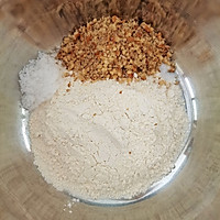 Weigh 150 grams of all-purpose flour, 50 grams of crushed dried walnuts, add 1 gram of salt and 10 grams of white sugar and mix;