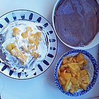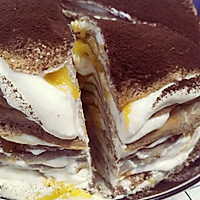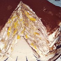 One layer of crust, one layer of cream, one layer of mango, and so on