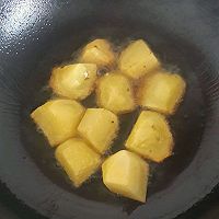The oil temperature is suitable, and the sweet potato cubes are fried in a pan.