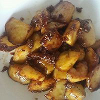 Pour the fried sweet potato cubes into the pan and stir-fry so that the surface of the sweet potato cubes is fully coated with sugar.