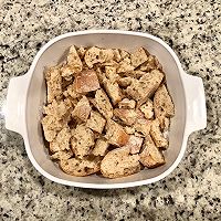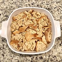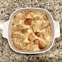 Remove the bread that has been soaked overnight from the refrigerator and the juices have been mostly absorbed.