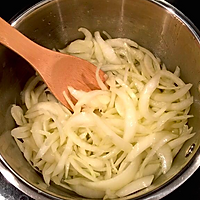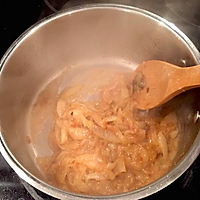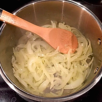 Stir-fry for about 10 minutes (be patient), the onion turns caramel, add the flour and mix well, then add the white wine and brandy, and let the alcohol cook almost volatilize (otherwise it will be bitter).