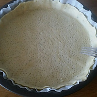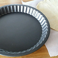 Spread the dough sheet into the pie tray, arrange the edges by hand, and point the holes with a fork. Cut off excess oil paper.