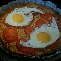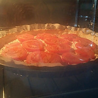Top layer with sliced tomatoes and a little herb on top. Put it in the oven, heat up and down the heat, and bake at 200 degrees for 15 minutes.