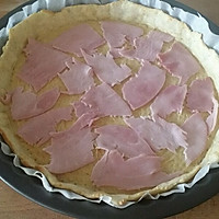 The first layer is spread with yellow mustard sauce, then ham slices or canned tuna.