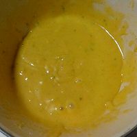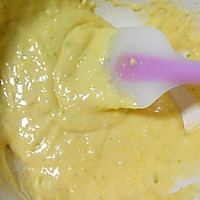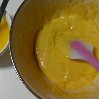 After sifting the low-gluten flour and baking powder, add it to the egg batter. Stir well with a spatula.