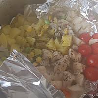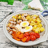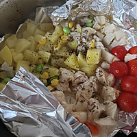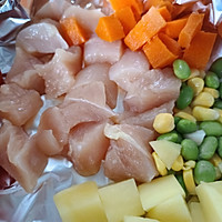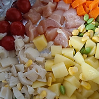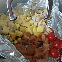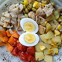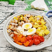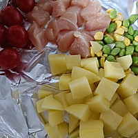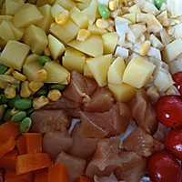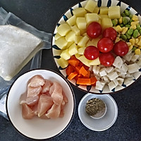 Prepare the ingredients: wash and dice potatoes, lotus root, and carrots, wash and dice chicken breast, and wash cherry tomatoes