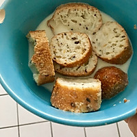 Slice or small pieces of baguette and soak it thoroughly with milk, because it is an old baguette, and the milk will not fall apart