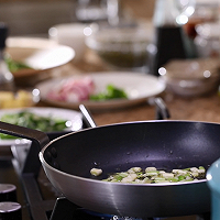 After pouring in the olive oil, add the green onions and sauté until fragrant, then add the boiled peas.