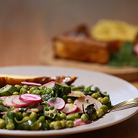 Serve the chives and mint pea salad on a plate and enjoy with freshly baked bread.