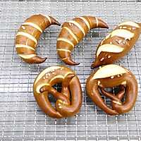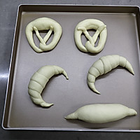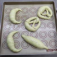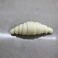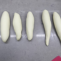 5 doughs, from left to right: the left is the heaviest, the finished product should be made in the shape of an olive; the two small ones in the middle should be made into Prejie; the two on the far right are rubbed into a long drop shape and should be made into a horn shape; The dough does not need to be left still, and the following operations are carried out after shaping separately;