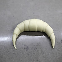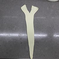The other two drop-shaped doughs are made into horn shapes: an inverted isosceles triangle with a length of about 35 cm, a cut in the middle of the wide side, and a length of about 4 cm;