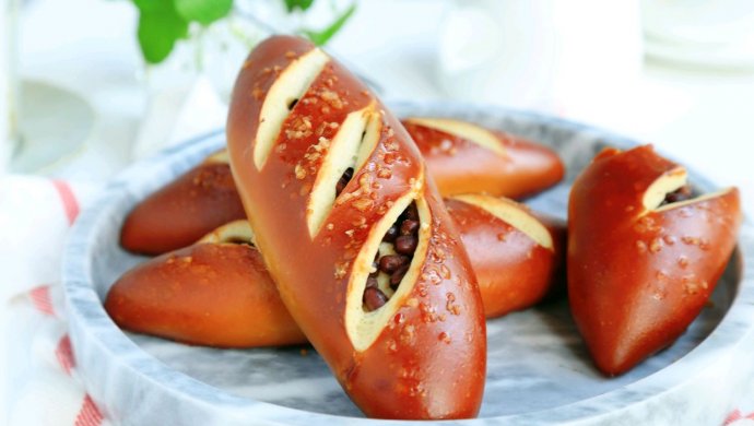 Divide into four parts, roll them into a beef tongue shape and add honey beans. In one dough put 30 grams like this.