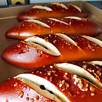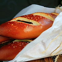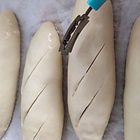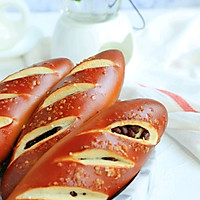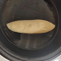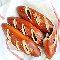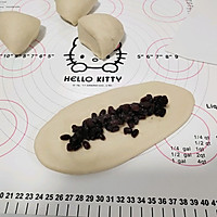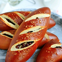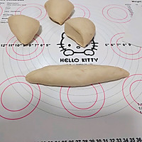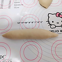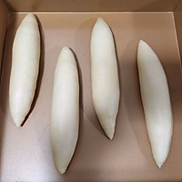 Divide into four parts, roll them into a beef tongue shape and add honey beans. In one dough put 30 grams like this.