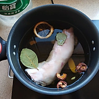 2 Add an appropriate amount of water, it is better to cover the pig’s hand with water, add ginger slices, dried hawthorn, dried lemon, bay leaves