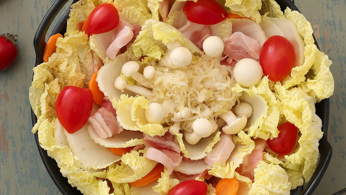 1) Take a deep pan, heat the pan over high heat for a while, turn to medium heat, pour in some oil, fry the bacon until slightly charred, add the carrots, and stir-fry. 2) Stir-fry for a while, then turn to high heat, pour in boiling water until it completely submerges the ingredients in the pot (don’t be afraid of adding too much water, just be afraid of adding less dry burning), add pork belly, whitening mushrooms, sauerkraut, cherry tomatoes, and cabbage at the top. 3) Pour the broth from the ingredient package into the pot, bring to a boil over high heat, turn to medium heat and simmer until the carrots are cooked and soft (10-15 minutes), then turn off the heat and eat.