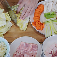 There are a lot of things to cut in this dish, don’t worry, the steps after cutting are extremely simple. 1) Wash all the vegetables, cut the green onion after two, throw away the outermost layer of skin, peel and slice the carrots, remove the roots and cut the cherry tomatoes in half, remove the roots of the whitening mushrooms, remove the roots of the Chinese cabbage and move it horizontally from the middle to the second (that is, divide the cabbage into two sections). 2) Cut the bacon into sections, wash and slice the pork belly, and take out the sauerkraut.