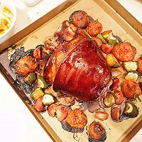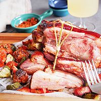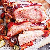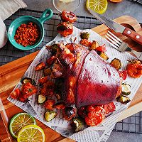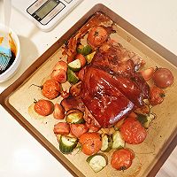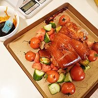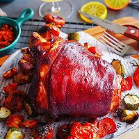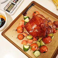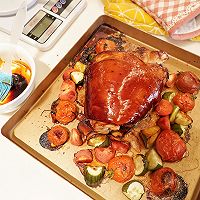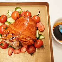 Put the steamed salted pork knuckles into a baking dish and brush the prepared sauce on the pork knuckles