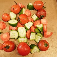 Peel the carrots and cut them with a hob, wash the cucumbers and cut them into pieces with a hob, wash the cherry tomatoes and put them together in a baking dish