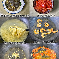 Ingredients: 1 handful of pasta, shrimp, tomato, green onion, ginger and garlic 1⃣Marinate for 10 minutes, 1 tablespoon of cooking wine ➕, ➕ ➕ 1 tablespoon of light soy sauce ➕, and a little black pepper 2⃣Cut the tomatoes into cubes, boil the pasta, remove and set aside