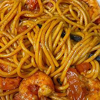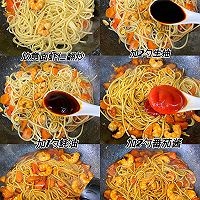 3⃣Heat the shrimp in oil and stir-fry until the color changes color and put on a plate, leave the base oil and minced garlic and sauté until fragrant, add the tomato cubes and stir-fry until soft and juiced; Add pasta and shrimp and stir-fry ➕2 tablespoons of light soy sauce ➕and 2 tablespoons of tomato sauce, stir-fry evenly, sprinkle black pepper and remove from the pan