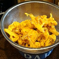 Cut the cauliflower into pieces and mix the batter with 3-5 tablespoons of water. Batter Material: 2 tablespoons sticky rice flour 1 tablespoon flour 1 tablespoon cornmeal 1 tablespoon cooking oil 1/4 tsp baking soda 1/2 tsp salt 1/2 tsp ginger garlic A pinch of turmeric powder