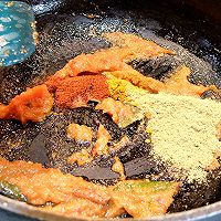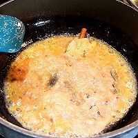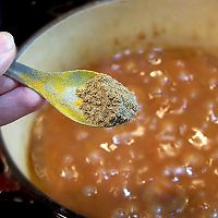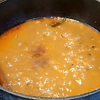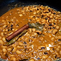 After stir-frying for about 1 minute, pour in the freshly cooked eyebrow beans, add a cup of water, bring to a boil and simmer over medium-low heat for 20-25 minutes.
