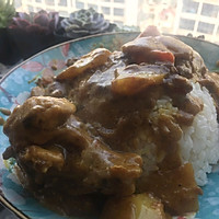 The rice is served in a small bowl, turned upside down on a plate, and topped with curry sauce!!