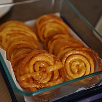 Use a piping bag or squeeze bottle to squeeze the batter into hot oil and fry it in a circle from the middle to the outside, fry the rings over medium and low heat until golden brown.