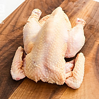 After cutting off the chicken neck, head and chicken feet with poultry scissors, use kitchen paper juice to absorb the moisture on the surface of the chicken, and fold the tips of the chicken wings into the back of the chicken.