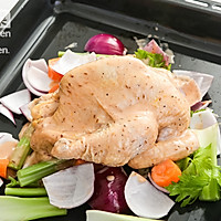 Preheat the oven to 190°C for more than 20 minutes, turn on the fan, wrap the baking sheet in tin foil, add the onion, celery, and carrot mixture, drizzle with olive oil and stir well, add the marinated whole chicken, pour in the roast chicken sauce, and bake for 50 minutes.