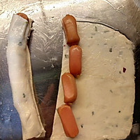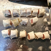 Grease the iron plate, use all the thawed flying cakes in half, roll in the Vienna sausage, and roll a little tighter
