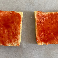 Prepare two slices of toast, place them in a baking dish and spread tomato sauce on the surface