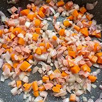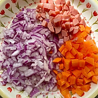 Prepare dice the onion, dice the carrot, and dice the ham and set aside