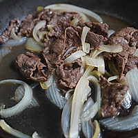 Serve the hot rice in a bowl, cover the onion beef over the rice, and pour some broth over it.