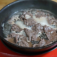 Pour white wine into a saucepan, bring to a boil over medium heat, add the beef slices and cook for a few minutes, skimming off the foam. Add the soy sauce, mirin and fine white sugar, cover and cook for a few more minutes.